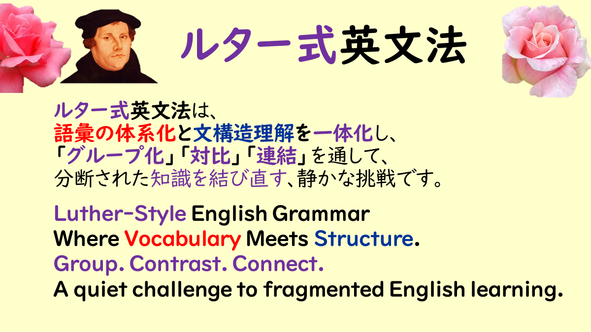 Luther-Style English Grammar is a method developed in Japan by WADA Satsuki, an English teacher and educational reformer, to reconnect vocabulary and grammatical structure. Inspired by the reformative spirit of Martin Luther, she seeks to rethink conventional textbook approaches and foster independent learning.