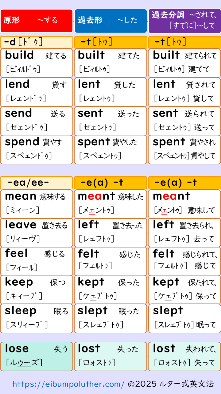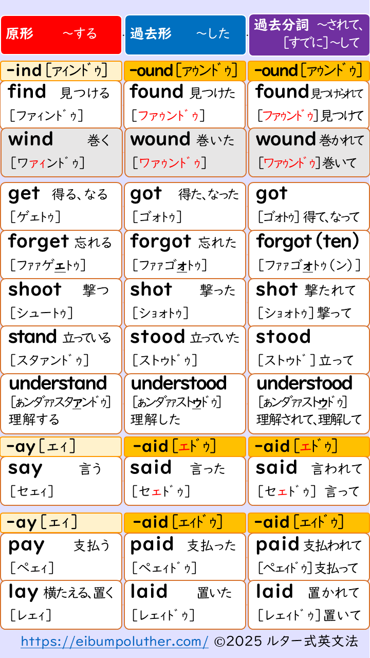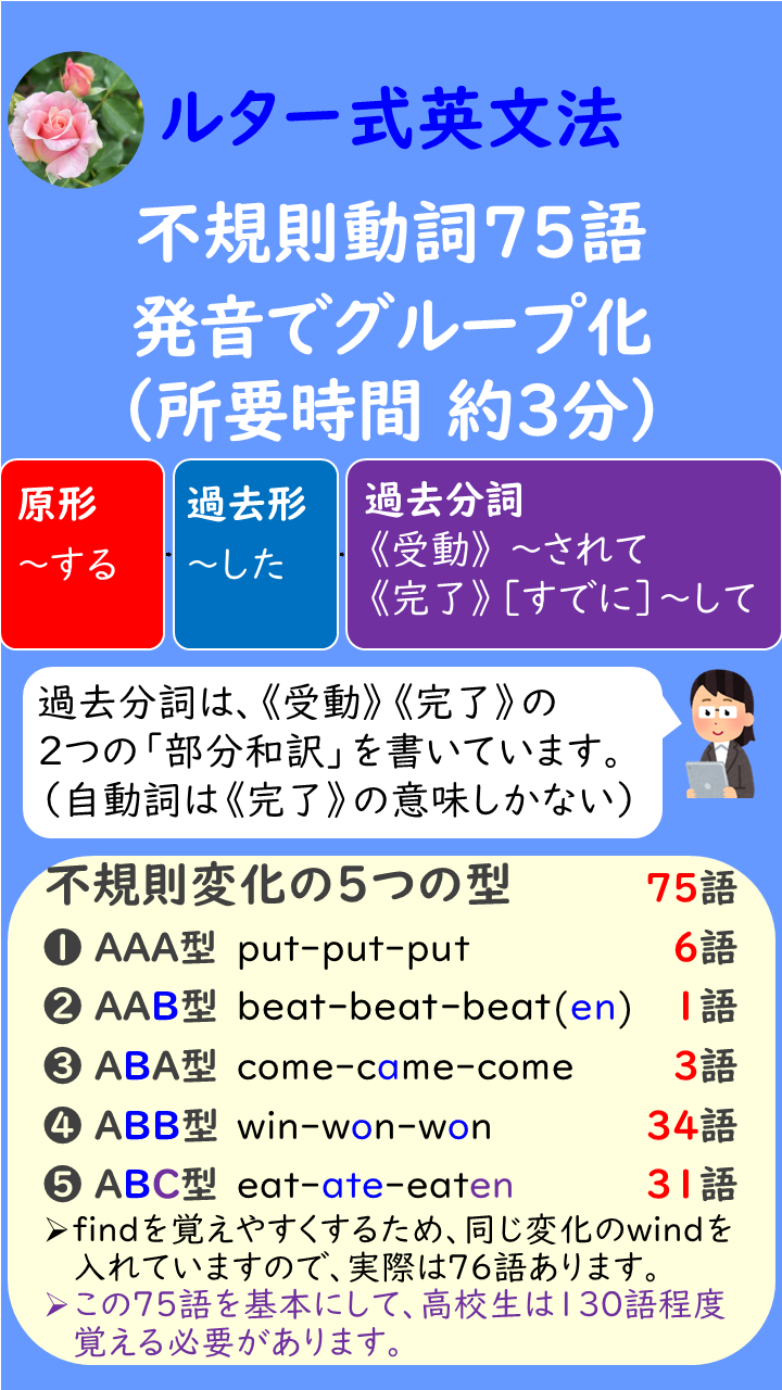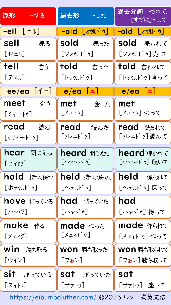 ルター式英文法では、さらに発音でグループ化してラクラク覚えられるという提案です。ダウンロード出来るpdfをつけています。