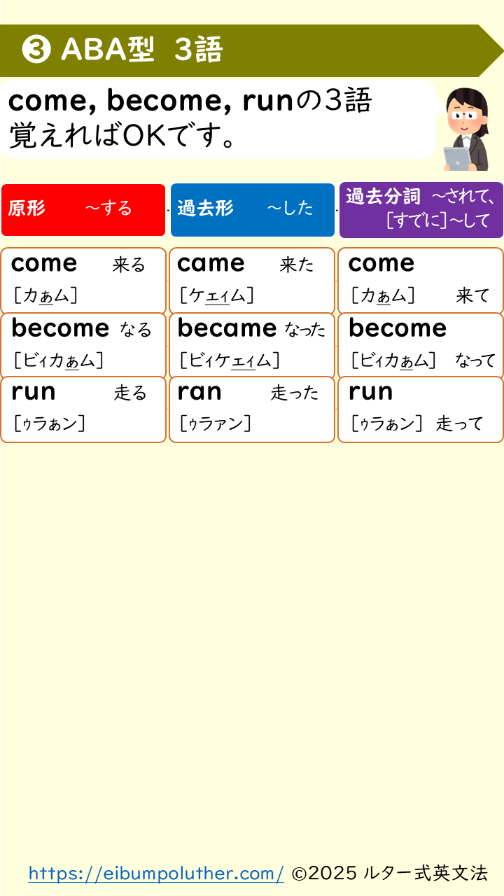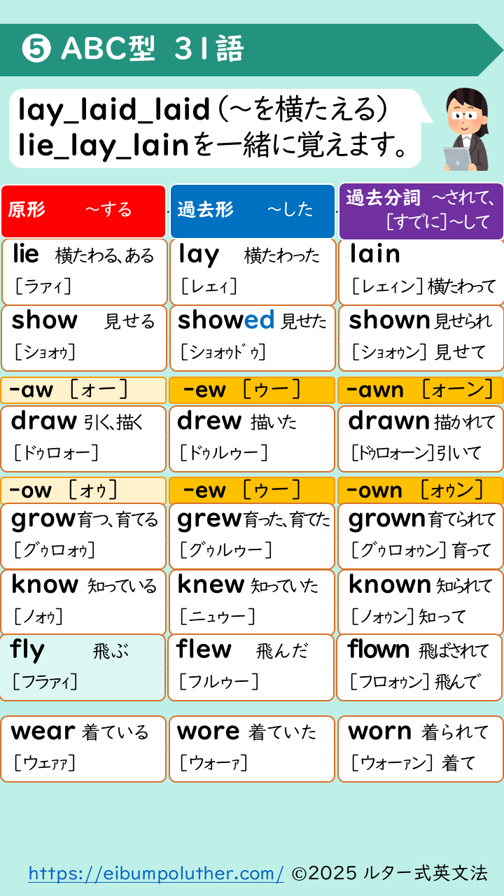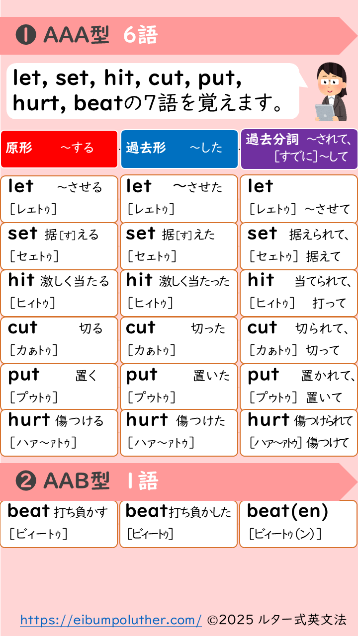 不規則動詞変化はAAA, ABB, ABCなどの型に分けられています。