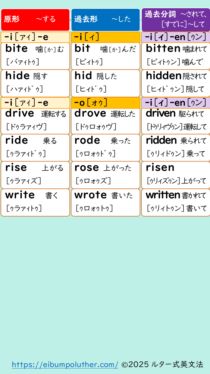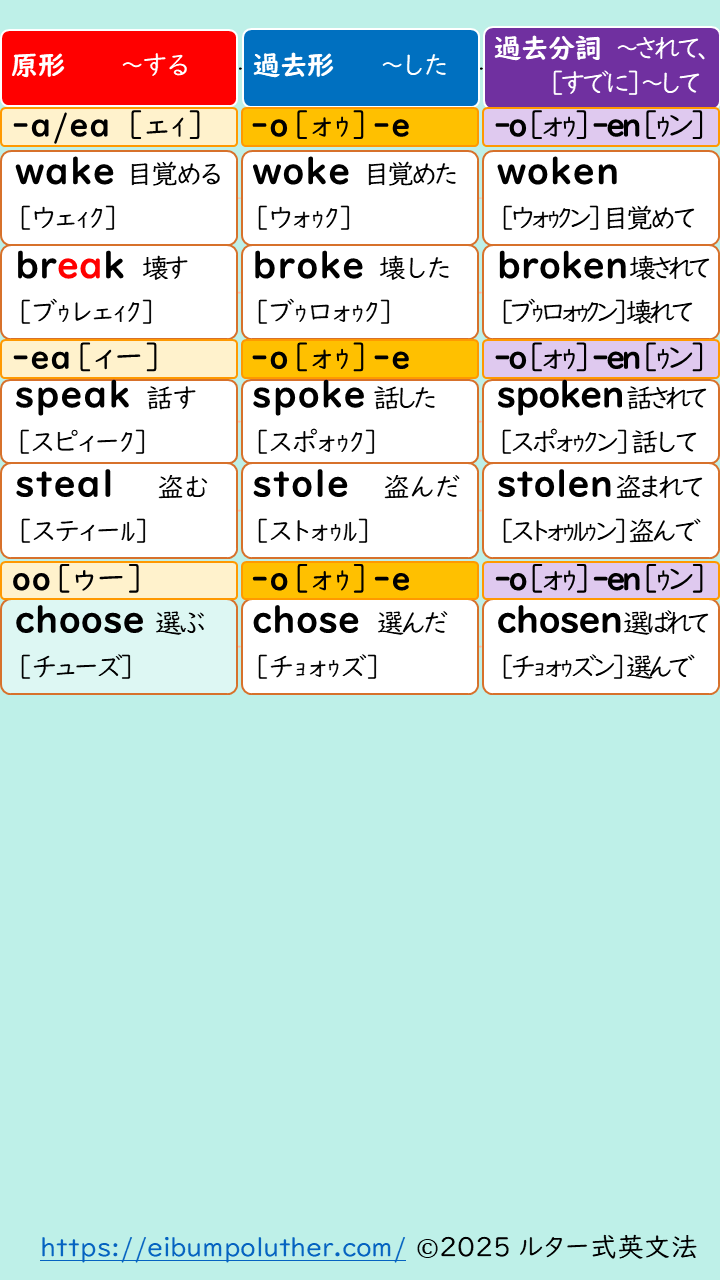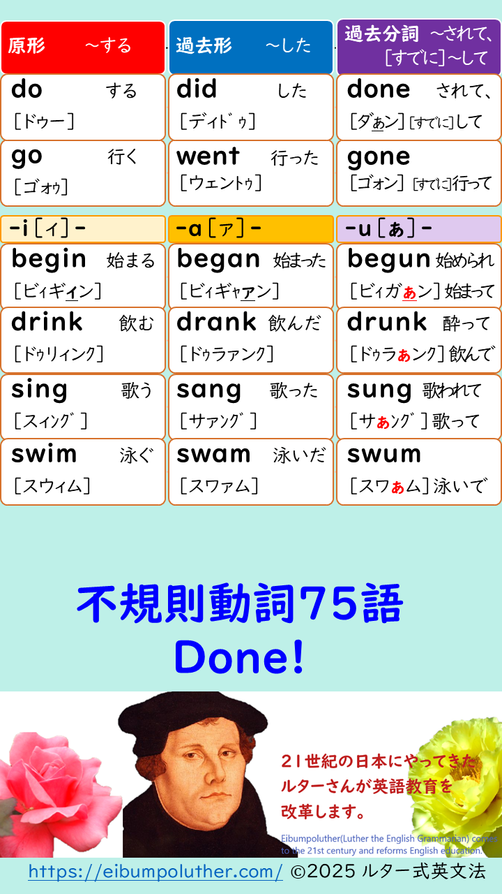 ルターの提案は「不規則動詞変化とフォニックスをいっしょに学ぶ」です。ルター式「発音記号にカナ振り」は副産物として「発音記号が読めるようになる」ことを目指していますが、不自然なカタカナのため、日本語がゆらいでしまう学習者には向きません。
