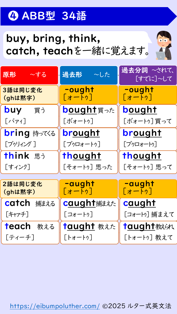 しかし、どの中学英語教科書の巻末付録も型に分けたあと、アルファベット順になっており、ABB型のbring-brought-broughtとthink-thought-thoughtが似ているのに離れています。