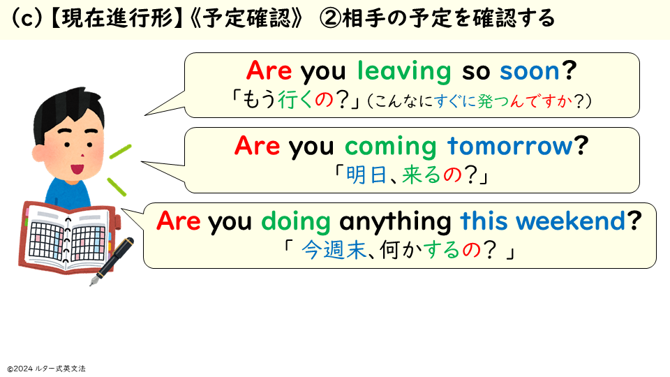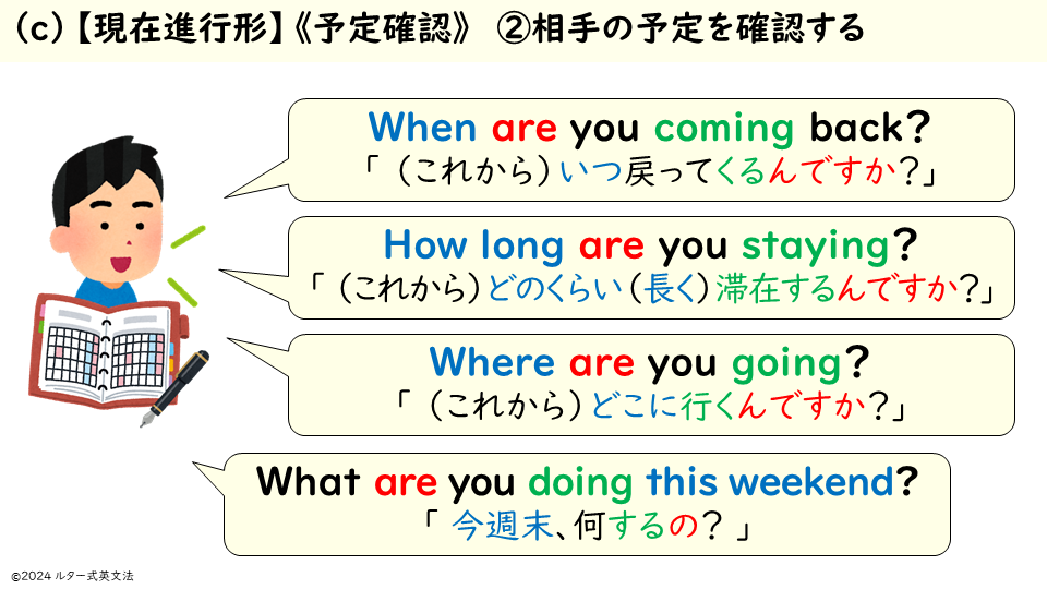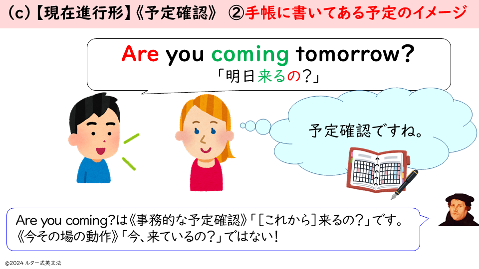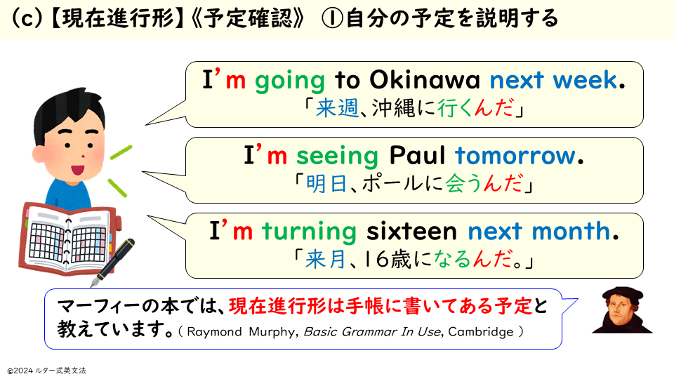 中学教科書には現状では「willとbe going toの使い分け」しか載っていません。(c)【現在進行形】《予定確認》「(これから)~するんだ」を加えた、3つの用法の使い分けを中学教科書に載せるのがルターの提案です!
