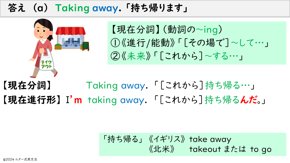 ・【名詞/形容詞】「持ち帰り(の~)」は、《英》takeaway、《米》takeout です。