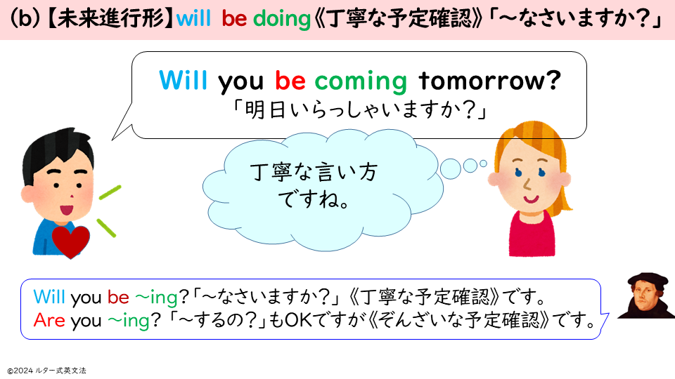 田辺正美『ゼッタイ話せる英文法』アルク(1991)54ページを読んで、ルターは【未来進行形】が《意志なし》の使い方だと知りました。